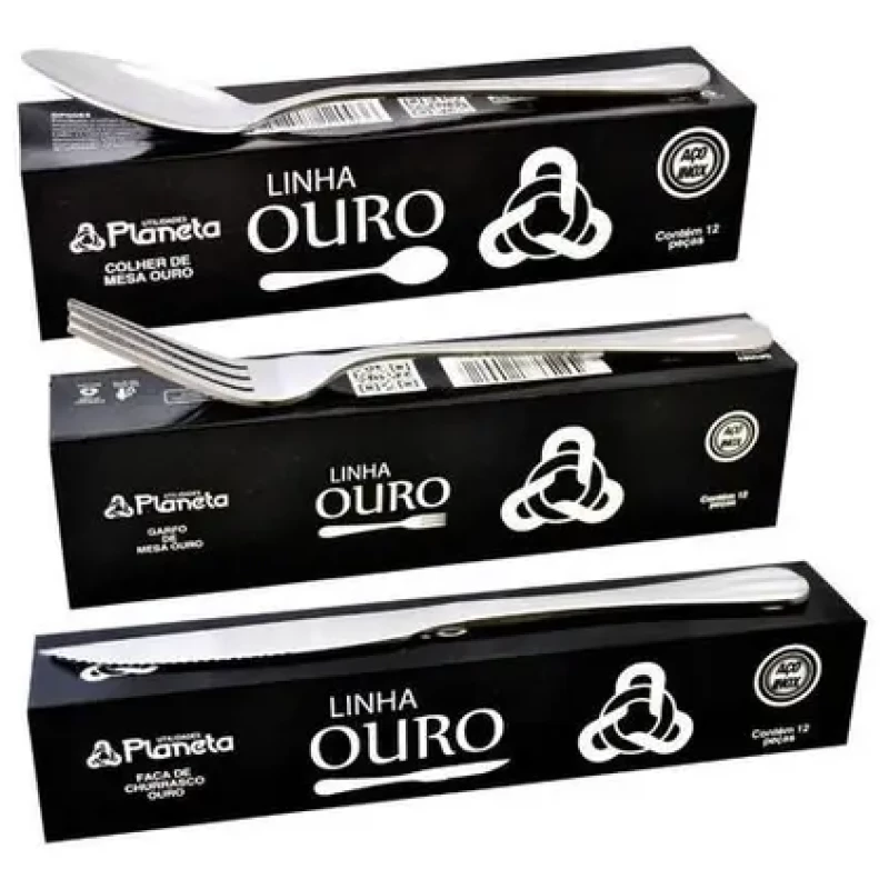 A Linha Ouro tem garfos, facas e colheres de inox, com excelente acabamento e alta resistência.